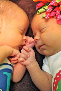 They aren't smiling yet. I am really looking forward to that! I guess they'll be a little slower since they were 4 weeks early, but I am certainly ready for a little encouragement that they like me - at least some small fraction as much as I like them :) Last night Egan was fussing up a storm for Forest while I was nursing Zoe. After she was finished I asked him if he wanted to trade. He said, "I would feed him if I were you" but he had just eaten an hour and a half before. I was very proud that I snuggled him and talked to him and he calmed down. If I can't get a smile, at least I have that!